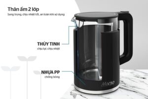 – Thân bình 2 lớp: ruột bình làm từ thủy tinh cao cấp chịu nhiệt tốt, vỏ bình là chất liệu nhựa PP cách nhiệt, chống bỏng, mâm nhiệt chất liệu inox 304, chống bám cặn, an toàn khi sử dụng.