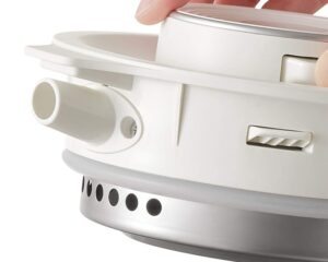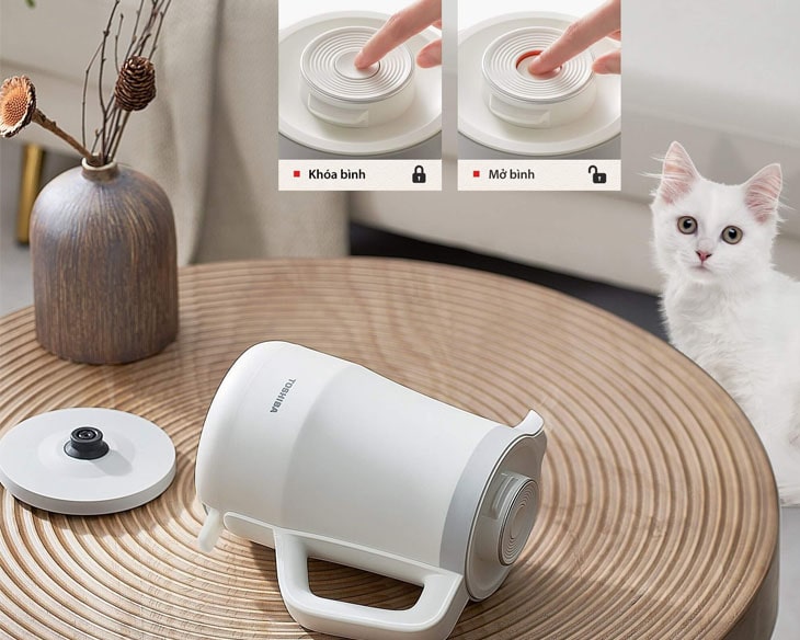 – Nút nhấn khóa nước được trang bị trên nắp bình giúp chống tràn hiệu quả: ngay cả khi bình đun bị ngã nước cũng không đổ ra ngoài, hạn chế nguy cơ bị bỏng khi đổ nước.