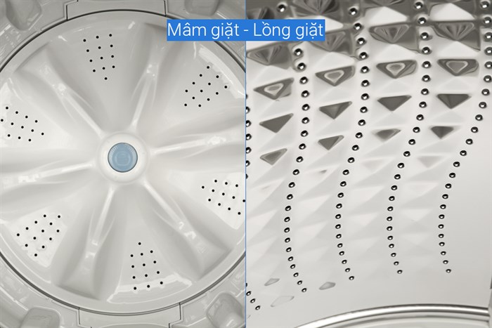 – Lồng giặt bằng thép không rỉ hạn chế rỉ sét, thiết kế các lỗ thoát nước nhỏ giảm khả năng làm tưa sờn mặt vải, bảo vệ quần áo, đảm bảo hiệu quả giặt giũ tối ưu.