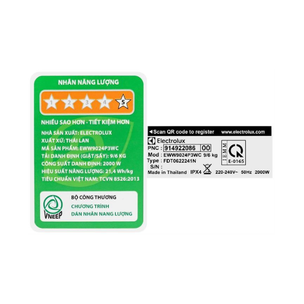 – Nhãn năng lượng 5 sao, hiệu suất sử dụng điện 21.4 Wh/kg.