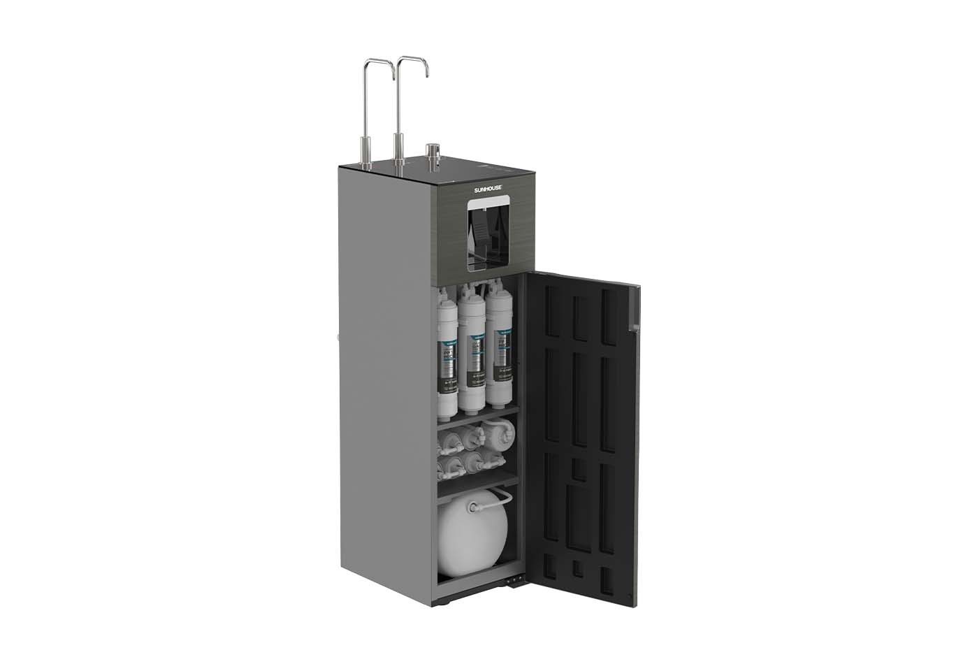 Thiết kế kiểu tủ đứng cùng tông màu xám hiện đại, mẫu máy lọc nước Sunhouse dễ bố trí ở nhiều không gian như phòng bếp, phòng khách,… Sản phẩm gây ấn tượng với mặt cánh cửa tủ làm từ inox phủ Nano Polymer cao cấp, chống bám vân tay, bền đẹp theo thời gian, tạo điểm nhấn cho không gian nội thất.