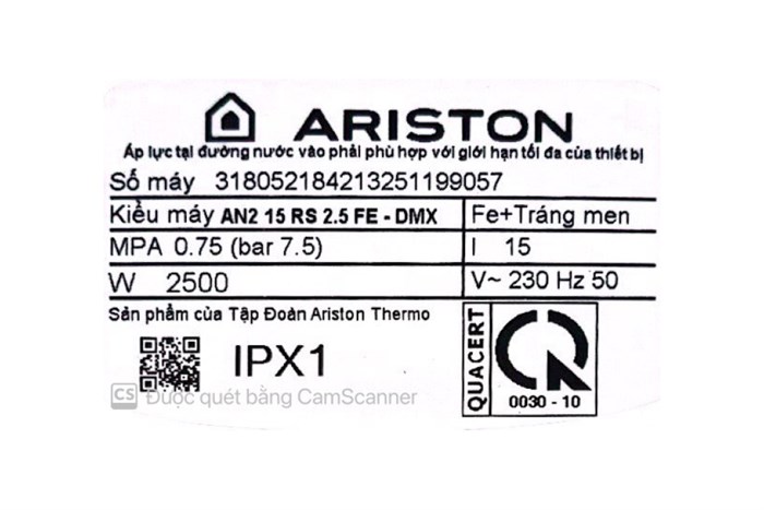 Máy nước nóng gián tiếp Ariston 15 lít 2500W AN2 15 RS 2.5 FE