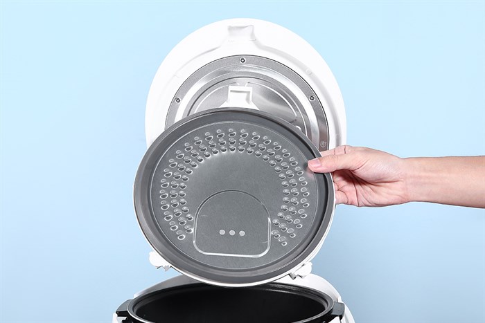 Nắp trong thiết kế tổ ong cùng van thoát hơi và khay hứng nước giúp nấu cơm không đọng nước gây nhão