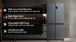 Kháng khuẩn khử mùi H-DEO Fresh: Khử mùi diệt khuẩn bằng ion bạc Ag+, ion đồng và chất liệu gốm, giúp ức chế sự phát triển của vi khuẩn và nấm mốc, từ đó giảm thiểu xuất hiện mùi hôi thực phẩm tối đa và giữ cho không gian bên trong tủ luôn được thông thoáng, sạch sẽ. Hơn nữa, công nghệ này cũng góp phần duy trì độ tươi ngon thực phẩm trong suốt thời gian bảo quản.