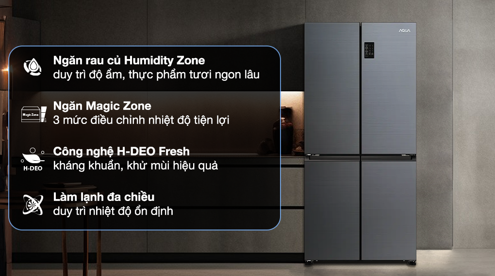 – Tủ lạnh Aqua với thiết kế kiểu dáng Multi Door – 4 cánh hiện đại, tạo điểm nhấn cho không gian bếp của gia đình.