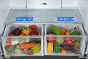 – Ngăn ẩm HCS: giúp bạn có thể bảo quản thực phẩm lâu. Độ ẩm 90% trong ngăn giữ ẩm ở mức tối ưu 90% được thiết lập tự động để lưu trữ trái cây, rau, salad,… tươi ngon nhưng vẫn an toàn cho sức khỏe.