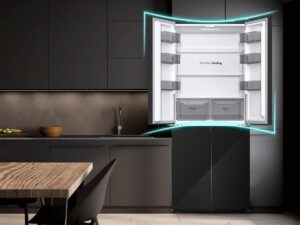 Tủ lạnh 4 cánh thiết kế mặt gương đen bóng loáng mang đến sự tinh tế, sang trọng, phù hợp với nhiều phong cách nội thất hiện đại. Bề mặt kính không chỉ giúp tạo hiệu ứng phản chiếu ánh sáng, làm không gian bếp trông rộng rãi hơn mà còn dễ lau chùi, bền đẹp theo thời gian.
