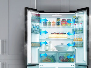 Hệ thống Multi Air Flow gồm nhiều lỗ thoát khí được bố trí đều trong tủ giúp khí lạnh lan tỏa đồng đều khắp các ngăn, đảm bảo thực phẩm tươi lâu, giữ nguyên hương vị.